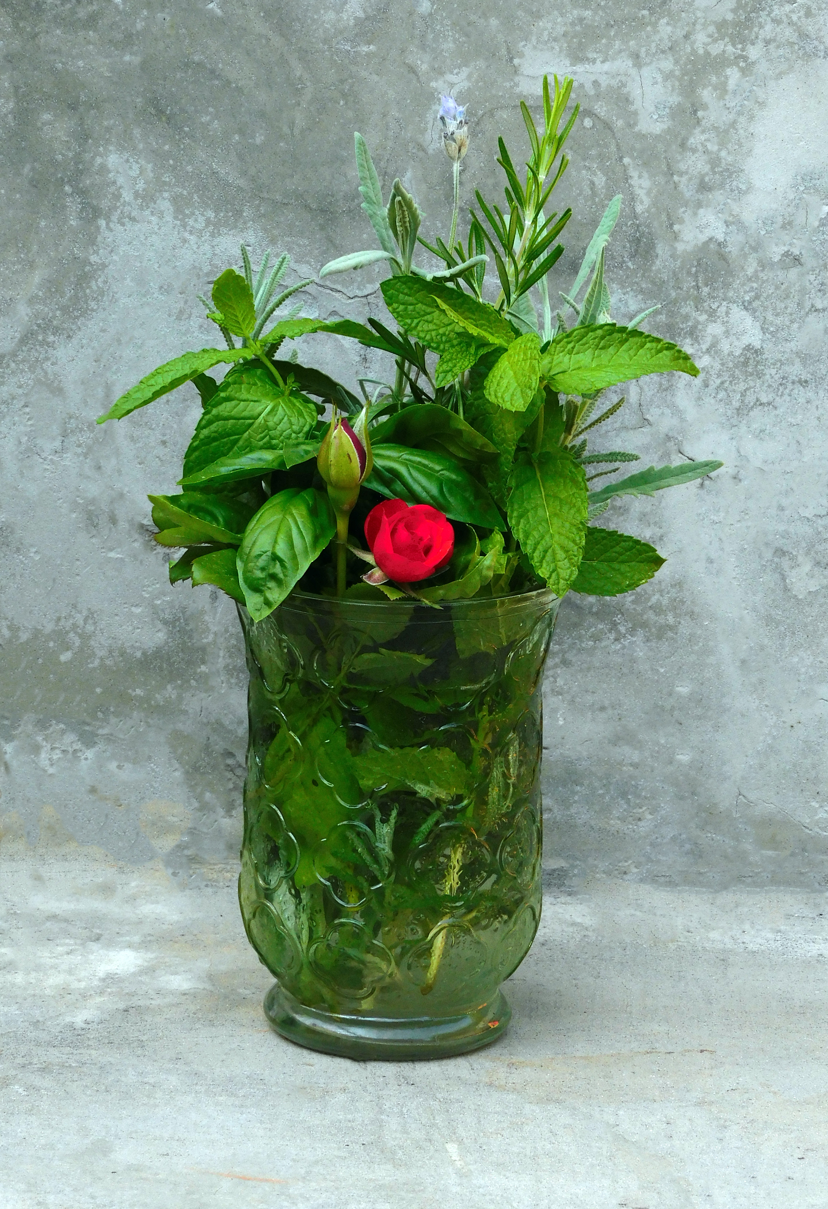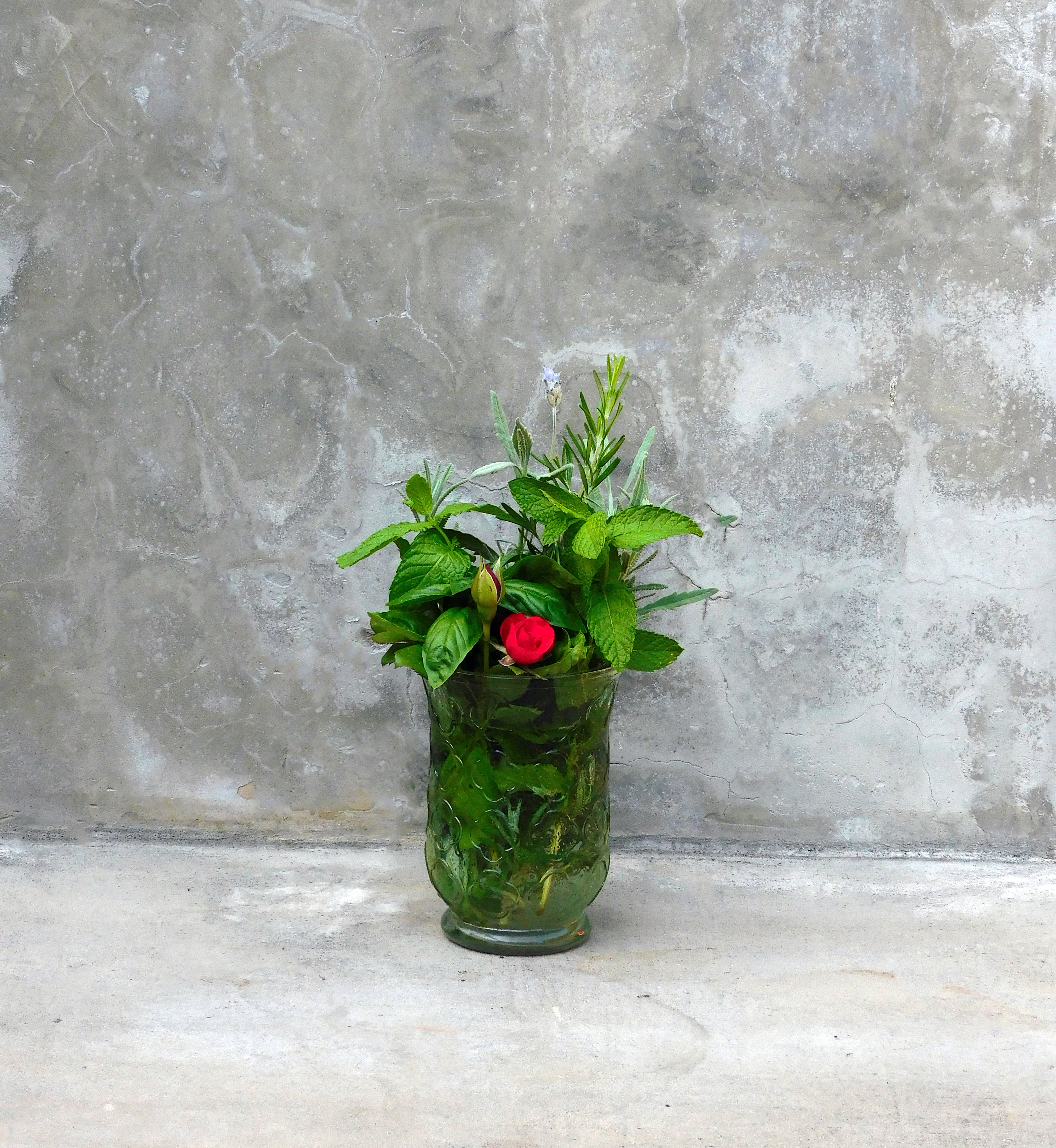 Me gustaría que pudierais captar el aroma de este sencillo ramo. No hay casi color: dos capullos de rosa que no huelen a nada, pero… tengo menta, albahaca, romero, salvia y lavanda. Todo recién cortado, con agua y un cubito de hielo.