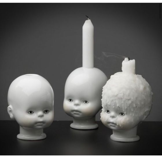 El porta velas cabeza-niño que está pensado, en su totalidad estética, incluso para el rastro de cera fundida.
